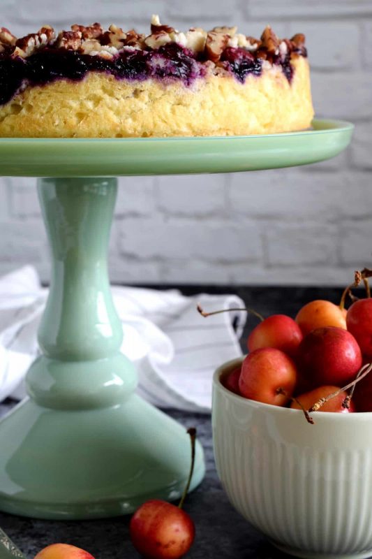 In terms of baking, you can bake this cake in a 10″ spring form pan like I did, or you can use a 9 x 13″ baking dish. I used the spring form pan so that I could place the humble cake on a pretty cake stand; not that the cake needed anything to help it be pretty, but because I love cake stands!