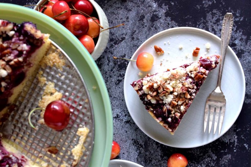Cherry cake, especially the black forest type, or cherry pie, has to be close to everyone’s favourite type of dessert. I think anything dessert-wise with cherries as the star is the ultimate early summer dessert. And, if you already have cherry pie filling on hand, you can use it up in various ways, like this Cherry Cake with a Pecan Crumble Topping, for example.