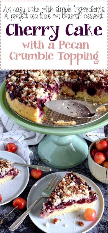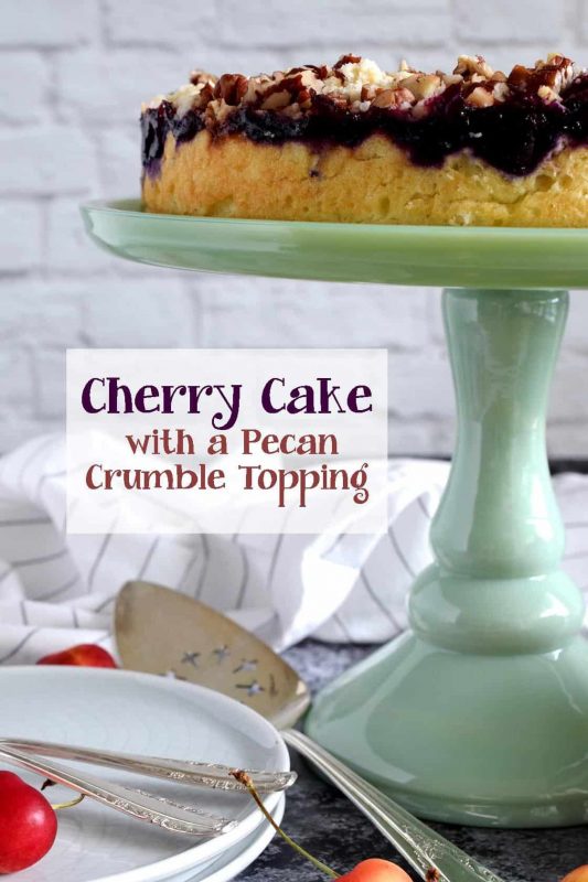 Cakes with crumble toppings, which are often referred to as coffee cakes, are meant to be easy and inexpensive. I like to call them non-pretentious cakes, because they don’t require any fussing around at all. The beauty of a cake like this Cherry Cake with a Pecan Crumble Topping is that you don’t need any cake decorating skills at all. And, sometimes, Dear Reader, I really don’t have the time nor the energy to make frosting and dig out my piping bags.