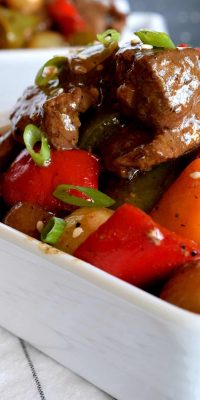 But, I was able to squeeze about four pounds of beef sirloin in there anyway. But, I knew I couldn’t keep the beef in there for very long, so this past Sunday, I had a beef cooking day. Yes, a beef cooking day – you read that correctly! I spent all of Sunday morning preparing two separate beef recipes, taking photos of the prepared dishes, and cleaning it all up. It was worth the effort, because both dishes were delicious. This Pepper Steak with Pearl Onions recipe was one of the dishes I prepared.