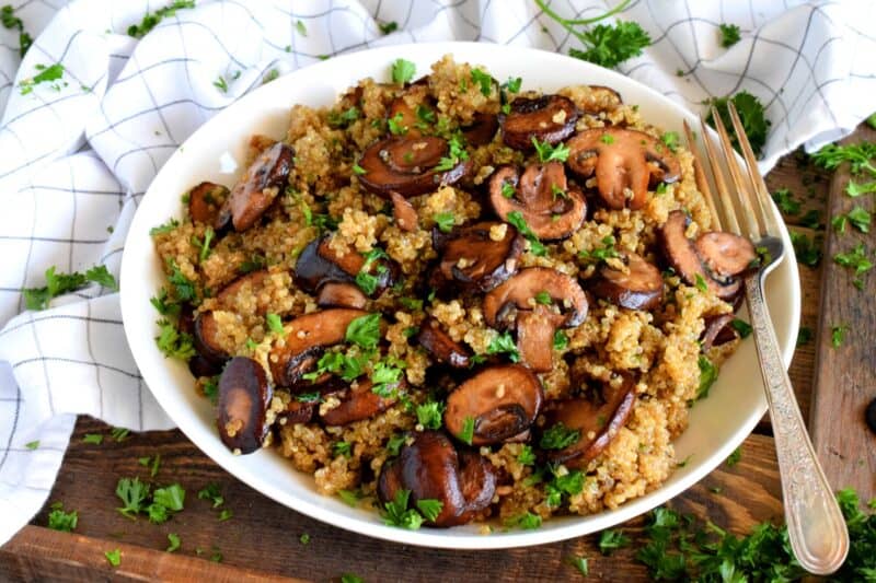 Garlicky Mushroom Quinoa is a rustic and simple side dish, but hearty enough to be a cozy main too! Prepared with meaty cremini mushrooms which have been pan-fried in lots of garlic and butter, this dish is both garlicky and savoury.