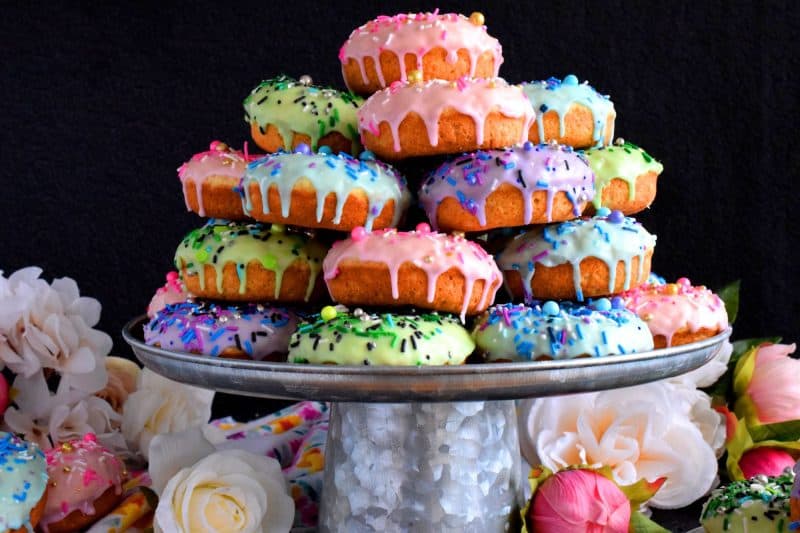 No mess, no fuss; that’s what this Springtime Stacked Donut Cake is all about! Just place a big cake stand right in the middle of your dessert table, pour up cups of hot tea or coffee for the adults, and a big glass of milk for the kids, and let them dig in. Everyone gets to choose their favourite frosting colour.