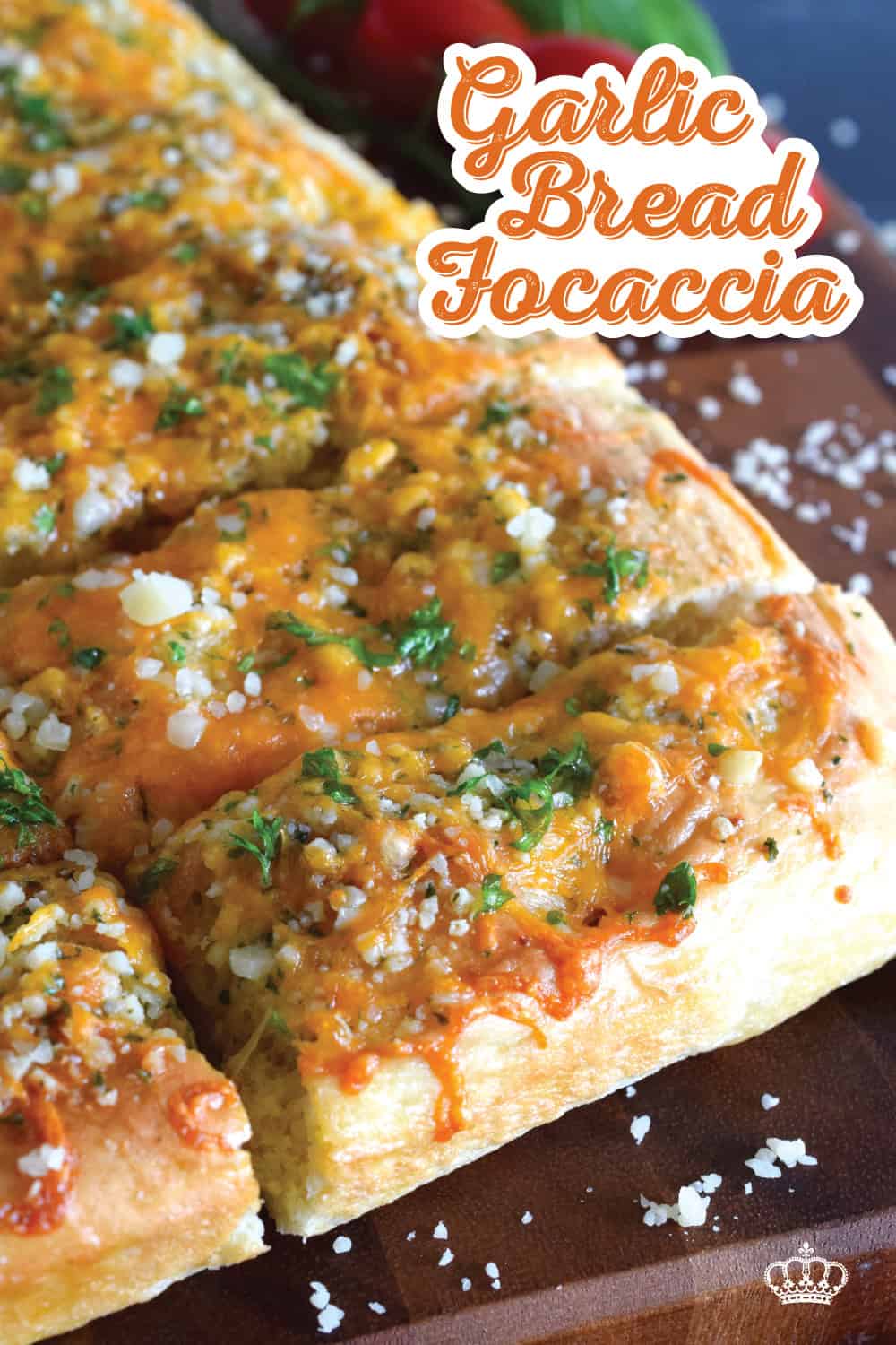 Prepared like the traditional version, this Garlic Bread Focaccia is light and airy on the inside with a crunchy exterior. Loaded with fresh garlic, parmesan and cheddar cheese, this bread is perfectly paired with pasta, soup, and pizza too, yet good enough to eat on its own as a delicious snack!