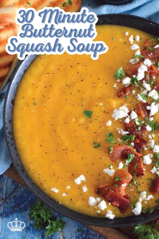 Save yourself some time by using store-bought, frozen squash for this recipe. It’s one of those one-pot, all ingredients in at the same time, type of recipes. 30 Minute Butternut Squash Soup is creamy, full of flavour, and a perfectly warm and cozy family meal!