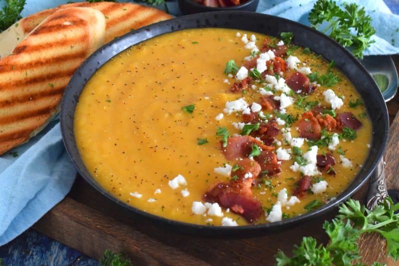 The taste of smoky bacon is perfect in butternut squash soup. I also like the saltiness of the crumbled feta. But, neither of them is required. John.e is a vegetarian and loves this soup just as it is! Although, he does eat it with bread and butter.
