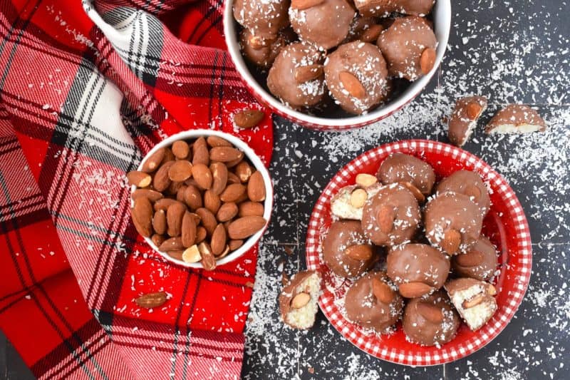 Hershey got it right when they first introduce the Almond Joy Chocolate Bar in 1946! This truffle version is an exact replica of the original, but in ball form. A center consisting of coconut and sweetened condensed milk is rolled into a ball and dipped into melted chocolate. The original has an almond on top, but my truffles have an almond in the center as well!