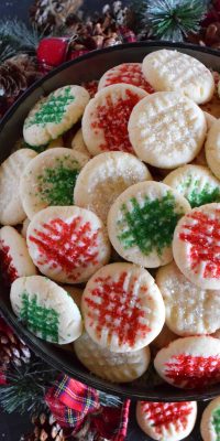 I love to make these cookies, not only because they are easy, but because they’re also fun to make. As you know, I love to use sprinkles, so that’s always a bonus. But, there’s something about creating a crisscross pattern in a cookie using a fork that reminds me of the old days. My most fond memories center around Christmastime.