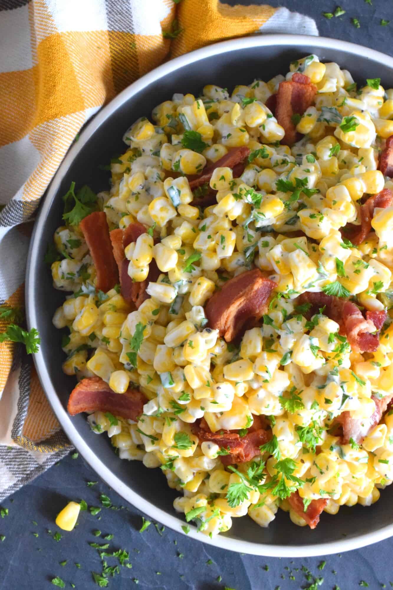 Serve this Bacon and Corn Salad warm as a side to your favourite summer grilled mains. Loaded with fried bacon, bright yellow corn, and fresh green onions, this salad is tossed with a kicked-up mayonnaise-based dressing. Can be prepared ahead of time too and just lightly reheated through just before serving!