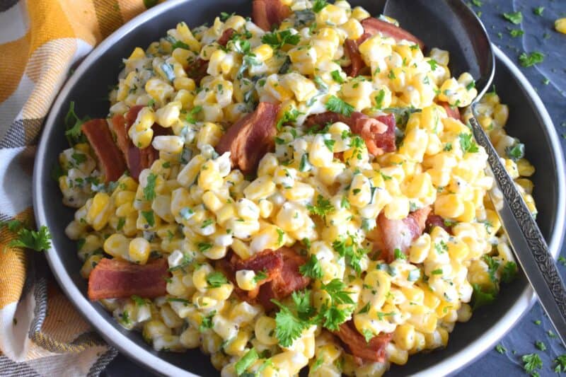 - Store-bought, pre-cooked, microwaveable bacon could be used here too. Good quality, real bacon bits are also a great choice! Cook the corn in a tablespoon of salted butter and add the bacon bits once the corn is thoroughly heated through.