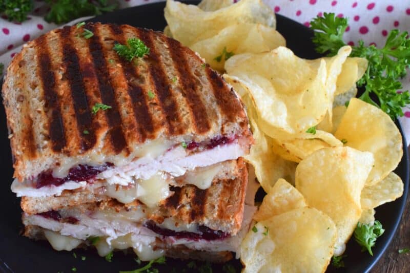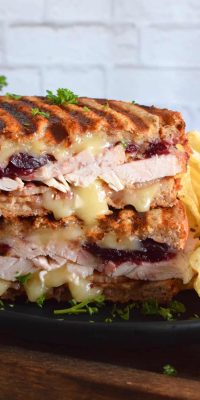 Stuffed to the max with sliced turkey, crispy bacon, and cranberry sauce, this Bacon and Turkey Panini is very moist and juicy. Oh, and it’s also loaded with melted, gooey cheese! This sandwich is the best way to use up your Thanksgiving leftovers! If you don’t have a panini press, don’t worry; I have a solution!