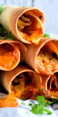 Truthfully, if I were to make these Breakfast Sausage and Egg Taquitos without spicy sausage links and without taco seasoning, I don’t think I would serve them with sour cream and salsa. I would just serve them with ketchup or just the way they are – plain, warm, crunchy, and cheesy gooey!