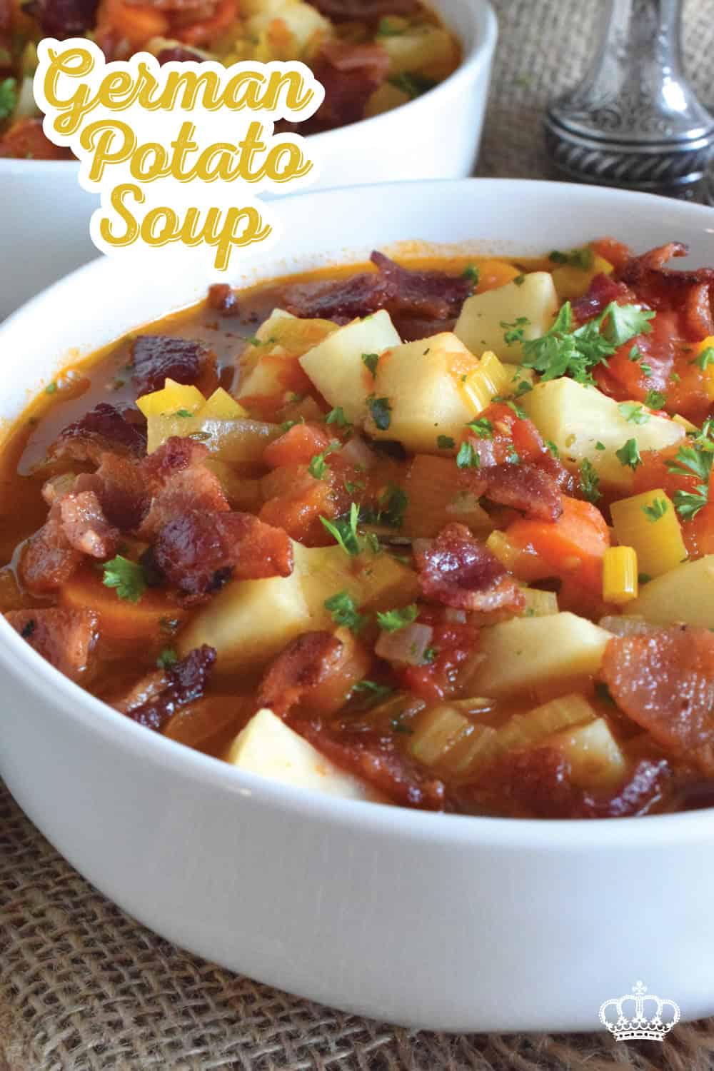 German Potato Soup starts off with bacon, which is a great start to any recipe! Loaded with lots of root vegetables like onions, potatoes, celery root, and carrots, this soup also has leeks, which is a wonderful addition to any soup! Hearty and filling, this soup recipe is certainly a keeper!