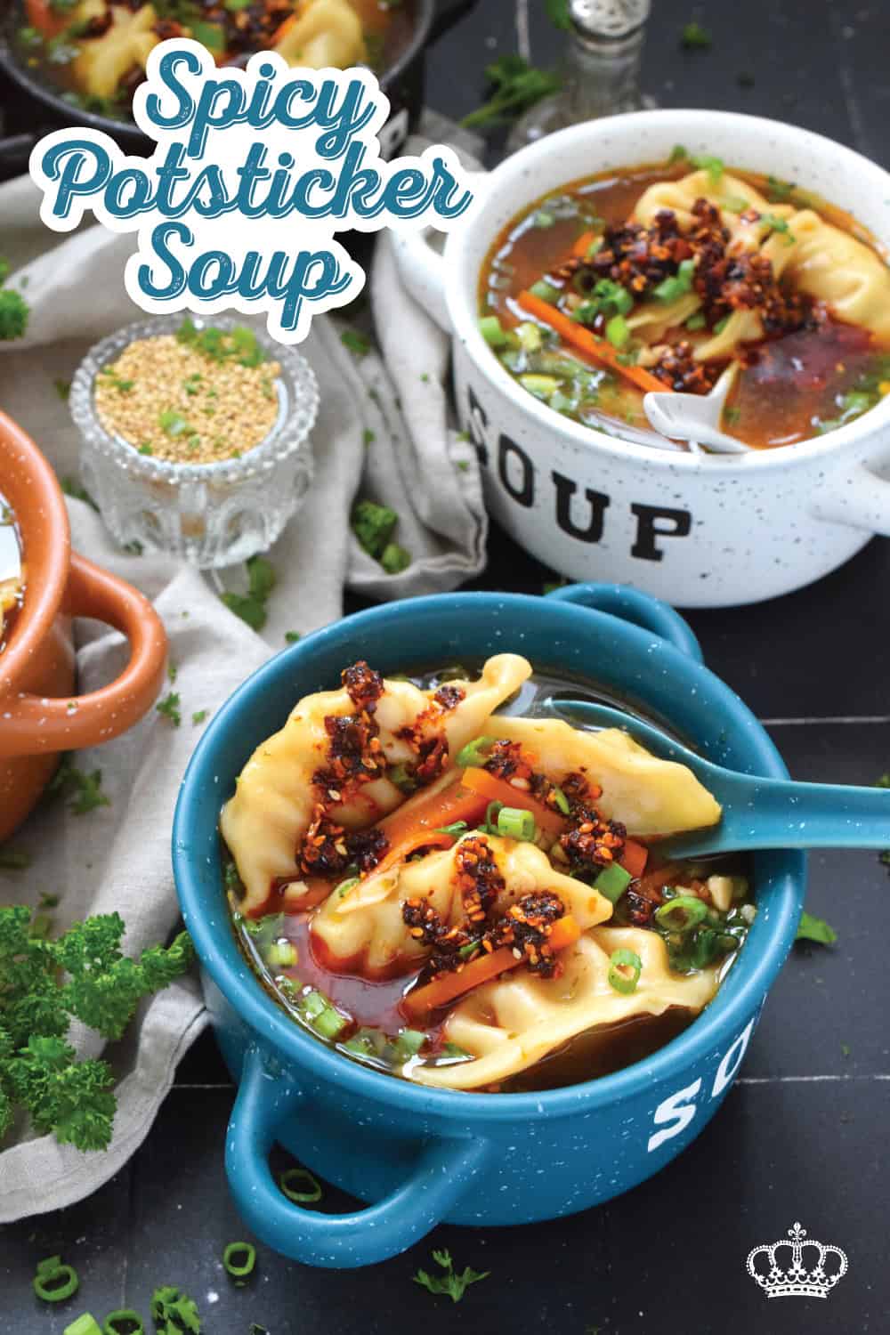 Pick up a package of frozen potstickers, wontons, or dumplings from your local grocery store and cook them in a savoury broth to make the most deliciously wonderful Spicy Potsticker Soup. Loaded with green onions, garlic, ginger, and carrots, this soup is good for you too!