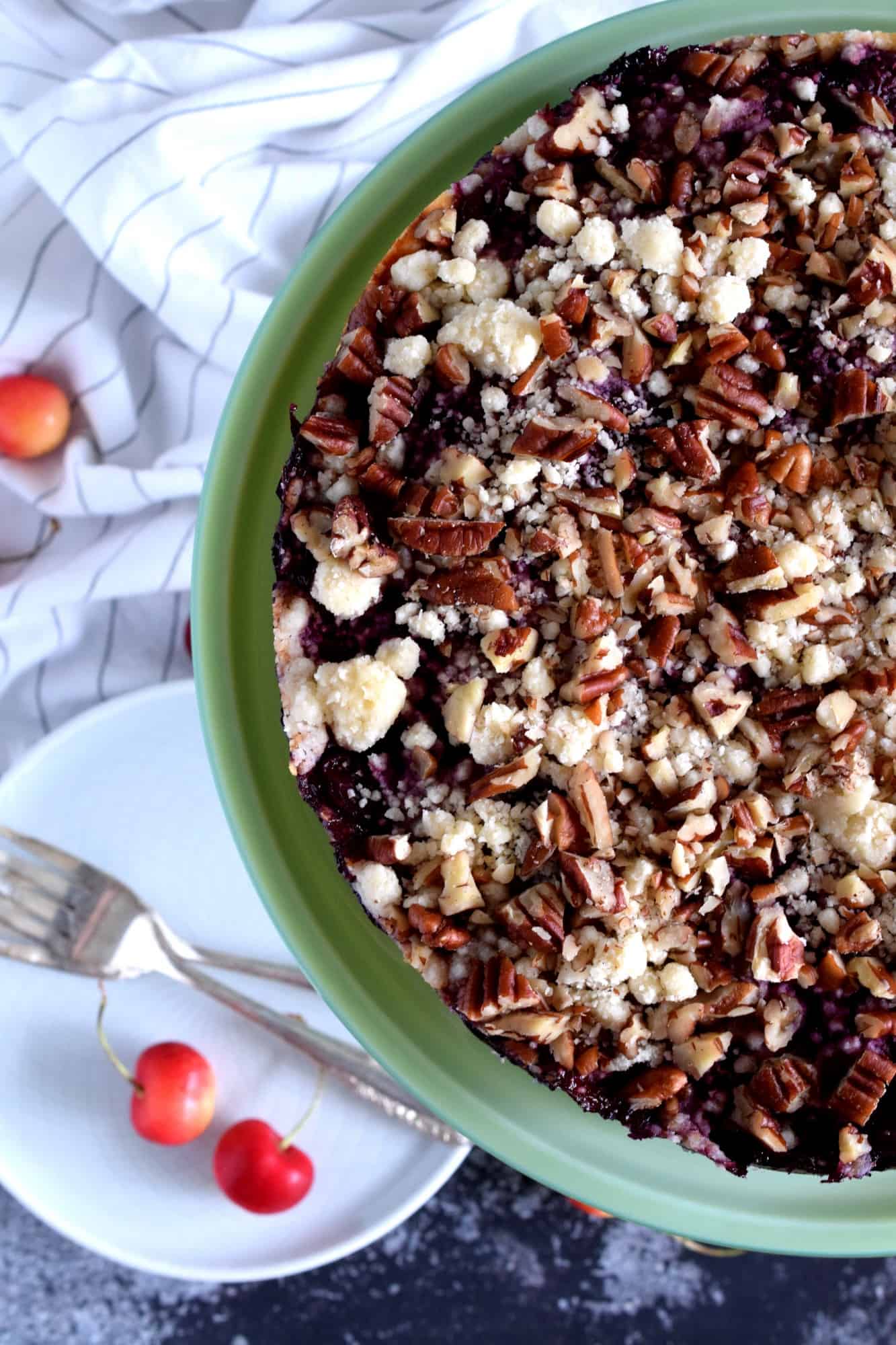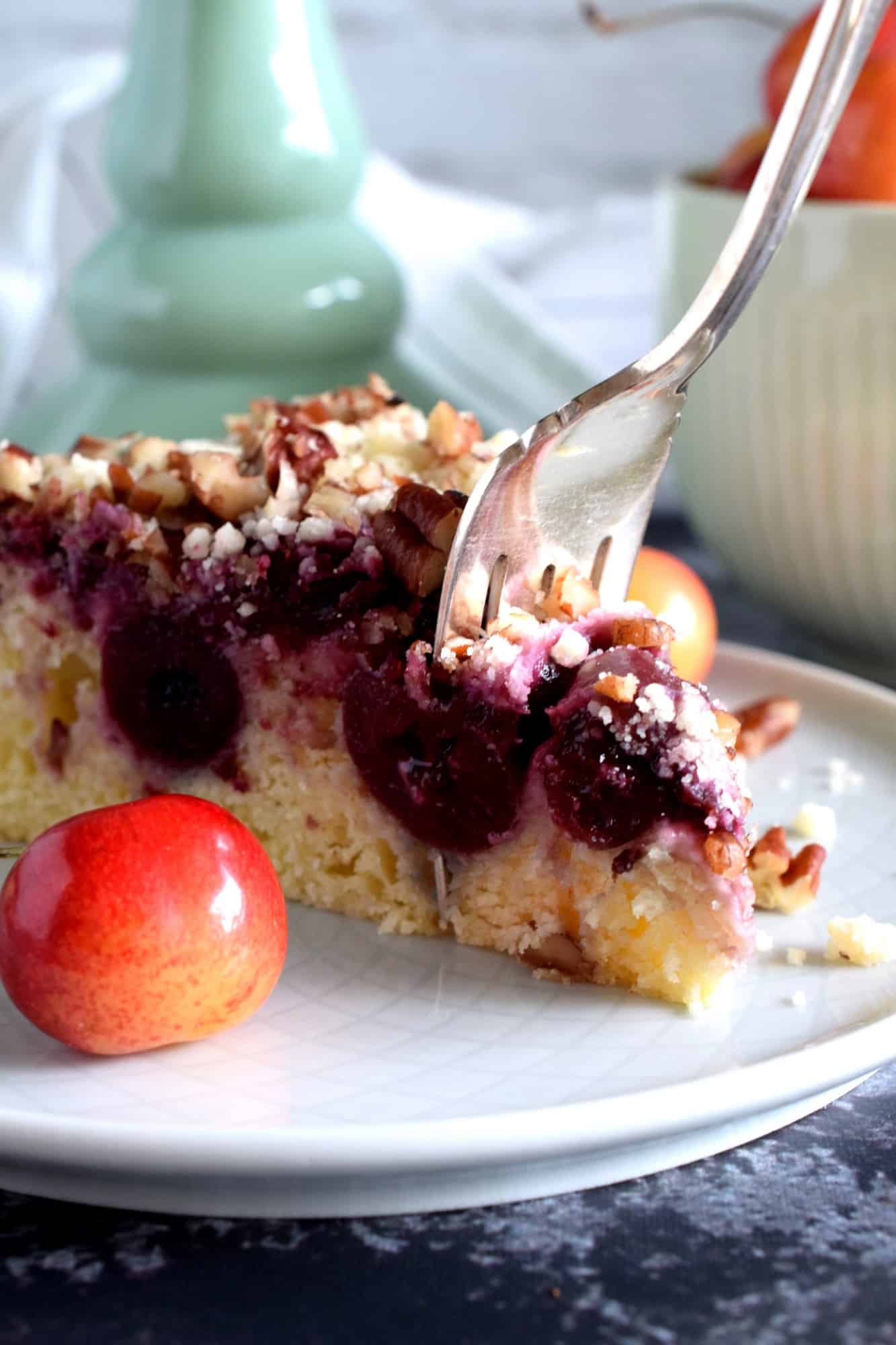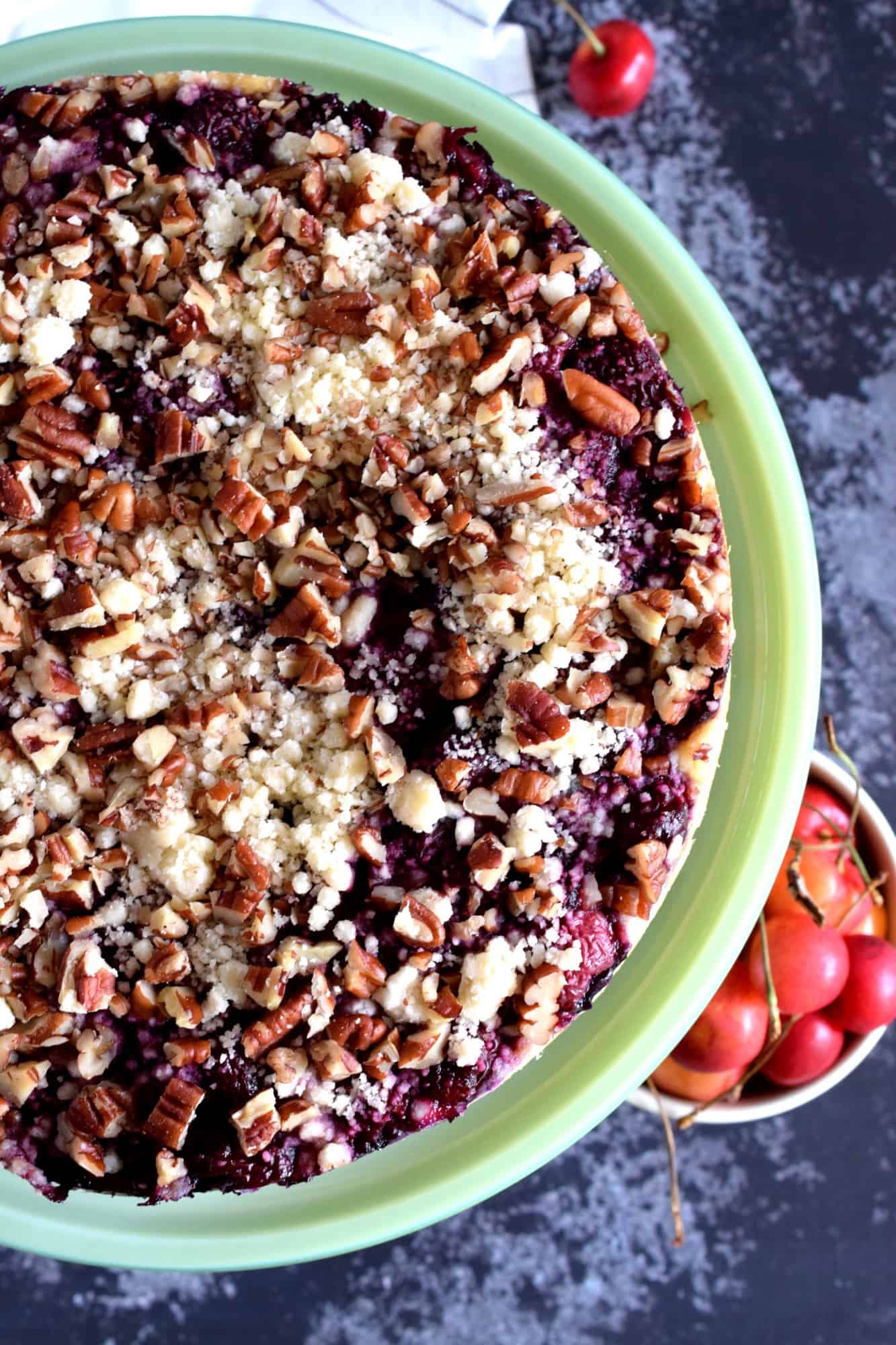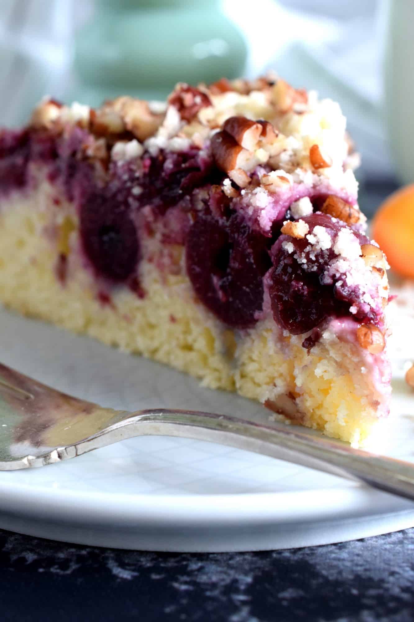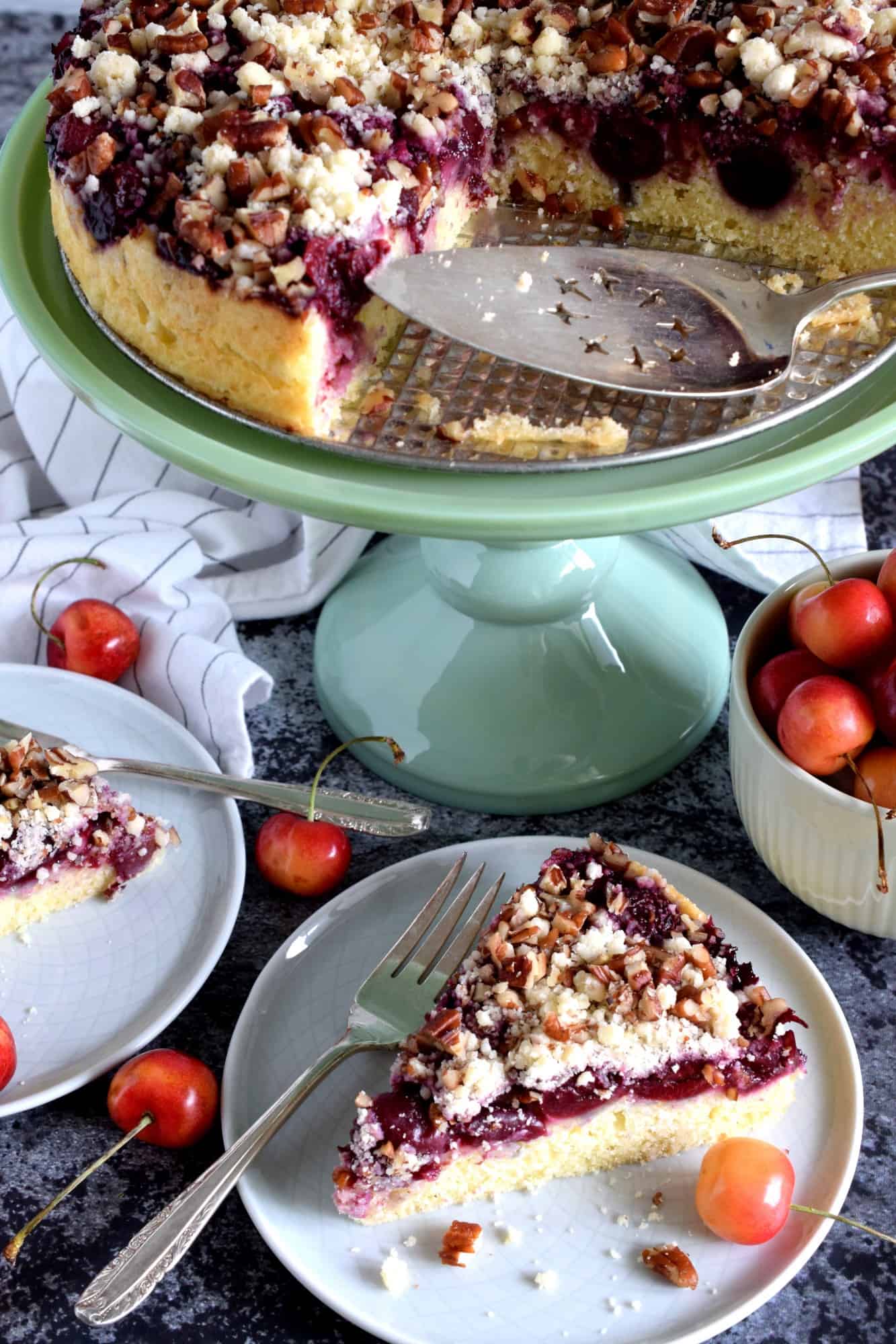 Cakes with crumble toppings, which are often referred to as coffee cakes, are meant to be easy and inexpensive. I like to call them non-pretentious cakes, because they don’t require any fussing around at all. The beauty of a cake like this Cherry Cake with a Pecan Crumble Topping is that you don’t need any cake decorating skills at all. And, sometimes, Dear Reader, I really don’t have the time nor the energy to make frosting and dig out my piping bags.