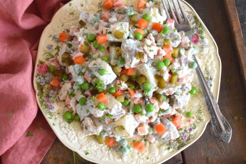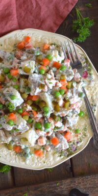 The combination of chicken and some version of a potato recipe has always been a classic meal, so why not combine the two? Chicken and Potato Salad is a mayonnaise-based, creamy salad prepared with peas, carrots, chives, and pickles too! This salad is a meal in itself, but also, perfectly and easily paired with any backyard BBQ mains!