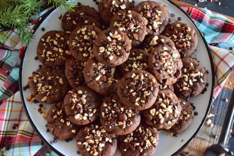 If you plan to freeze these Chocolate Hazelnut Cookies, you certainly can! Once they are completely cooled, pile them into a clean, food-safe container. The container must be freezer friendly! You’ll want to ensure a very tight fitting lid too. (I use these quite often when freezing baked goods.) I like to place a sheet of plastic wrap over the top of the container before pushing the lid on. This helps to create a better seal. The goal is to keep all of that cookie freshness locked in!