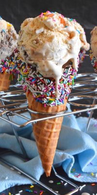 Alternatively, you can let the excess chocolate settle into the bottom of the cone. When the ice cream is all gone, and you’ve eaten you way down to the bottom of the cone, that extra bit of chocolate is a treat! Plus, the chocolate at the bottom of the cone will prevent any melted ice cream from dripping out the bottom and onto your shirt! When done, stand the cone up and move onto the next. When all cones are coated, transfer to your fridge for 30-45 minutes to harden.