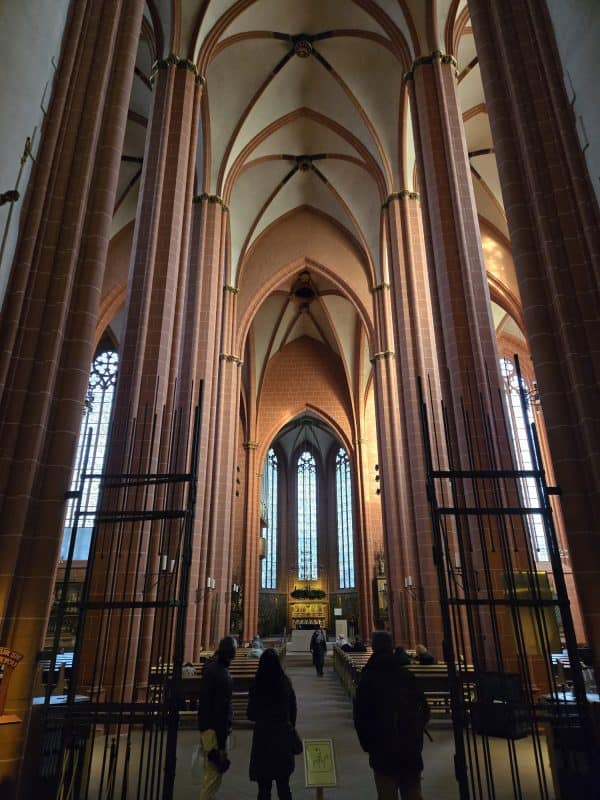 Likewise, the Cathedral of St. Bartholomew in Frankfurt was stunning and I’m so glad we took the time to tour it – twice! Sadly, in 1944, just like many German cities, Frankfurt was the target of bombing during World War II from the British royal air force. Much of the city, especially the half-timbered buildings that we all love, were destroyed and others burnt to the ground. Nearly all of the churches in the city were destroyed, except this one cathedral which managed to escape with only some minor damages.