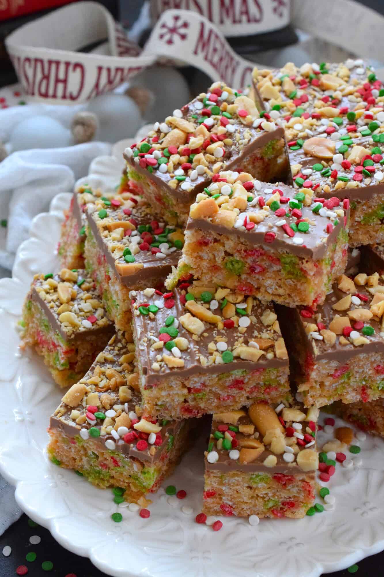 Remove the marshmallows from a Rice Krispie Treat and substitute it with melted chocolate and peanut butter for an even tastier treat! Prepared with Christmas-coloured cereal, these Christmas Peanut Butter Rice Cereal Squares are just as delicious as they look! Don’t forget the sprinkles; they make everything more fun and festive!