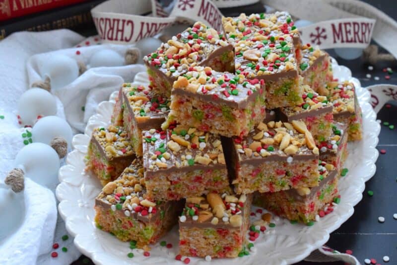 I think Rice Krispie Treats are the epitome of childhood happiness. Am I right? I can remember eating Rice Krispie Treats, or Rice Krispie Squares, as my mom would call them, ever since I was a little boy. A sense of nostalgia and the idea of something cute brought to life this version. I couldn’t be happier with how well these turned out and they are perfectly festive too!