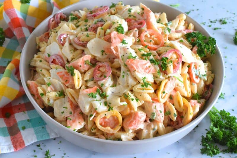 In May, I shared my recipe for Creamy Crab Salad. It’s a salad prepared with imitation crab, corn, cheese, chives, and seasonings. I shared the post on all of my social media platforms as I do with all of my recipes on the day I hit publish. This time, however, in one Facebook recipe group, my Creamy Crab Salad received well over 200 comments, most of which were pure hate and mockery. Let’s see if I can win them over with this Crab Pasta Salad.