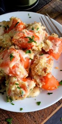 Baked to perfection, in a bubbly, creamy, cheesy casserole, with a crispy panko crumb topping, these carrots are delightfully simple and delicious!