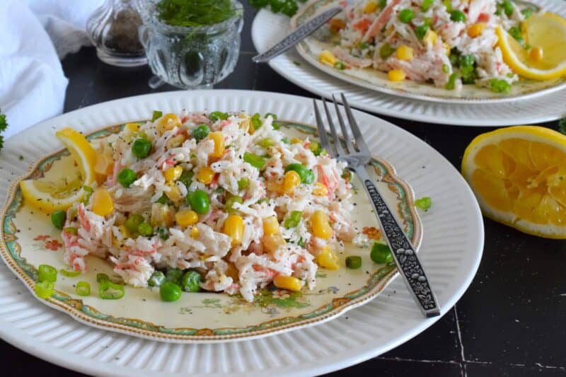 Prepare this recipe using real or imitation crab and leftover cooked rice. Great as a side, but hearty and filling enough to be served as a main, Creamy Crab and Rice Salad tastes light and fresh and is simply delicious!