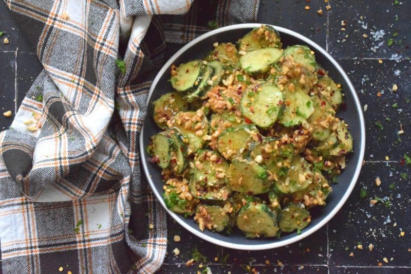 Fresh cucumbers are sliced and tossed in a quick and easy homemade nutty, salty, creamy, spicy, and garlicky sauce. Toasting the peanuts first and combining them with peanut butter, soy sauce, and rice vinegar makes a delicious cold side, salad, or snack. Serve at room temperature immediately after preparing for the best results!