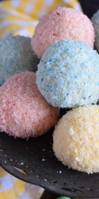 As tasty as they are pretty, Easter Bunny Coconut Tails are a no-bake, easy, kid-friendly recipe! They will love dying the coconut those pastel colours! These freeze quite well too, so you can make them in advance!