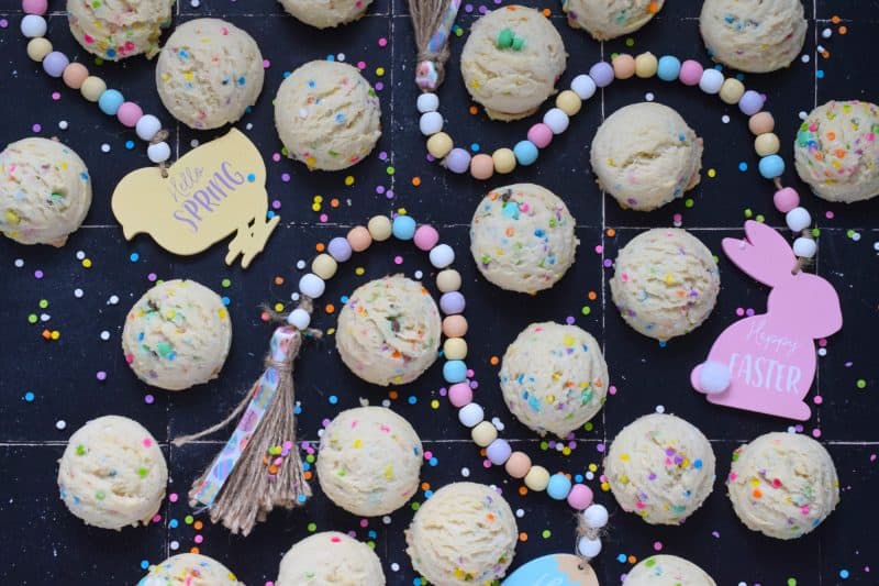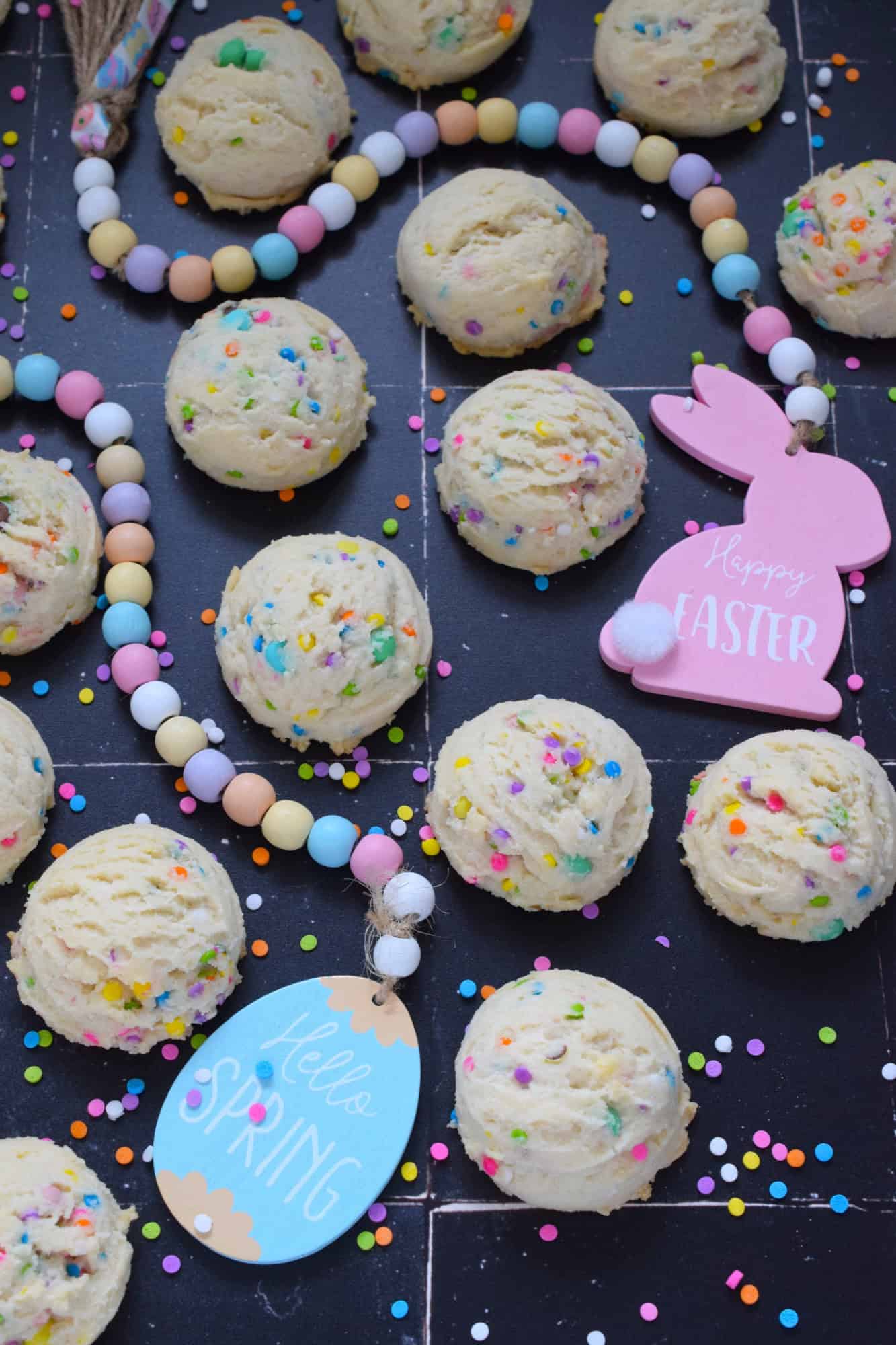 I absolutely love to make these Easter Condensed Milk Cookies! They’re just so easy to make! Not only do you get to mix everything together in just one bowl, but there’s no need to roll the dough into balls, or to use a rolling pin. Just use a cookie scoop to portion out the cookie dough, and set them right onto your prepared baking sheet. They hold their shape in the oven, and bake up light and airy.