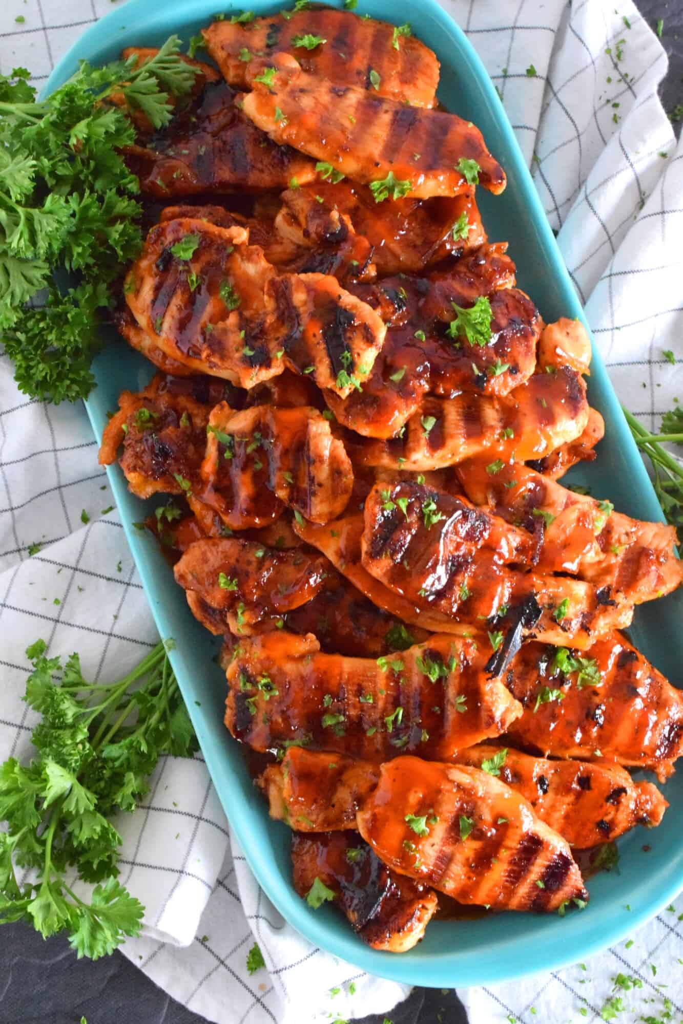For Grilled Catalina Chicken, I would highly recommend either boneless, skinless chicken thighs or chicken breasts. I love working with chicken thighs. No matter what cooking method I throw at them, they always come out tender and moist. I’m also a fan of dark meat.