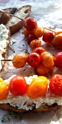This sounds awesome, our tomatoes are just beginning to ripen and we have some wonderful small teardrop shaped yellow cherry tomatoes that will be perfect for this dish!