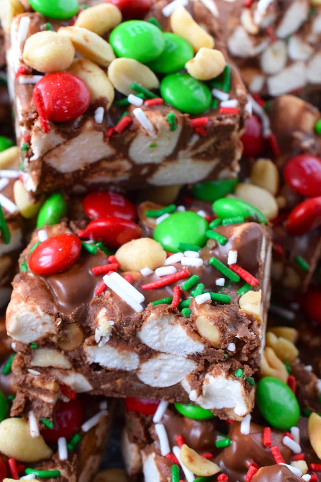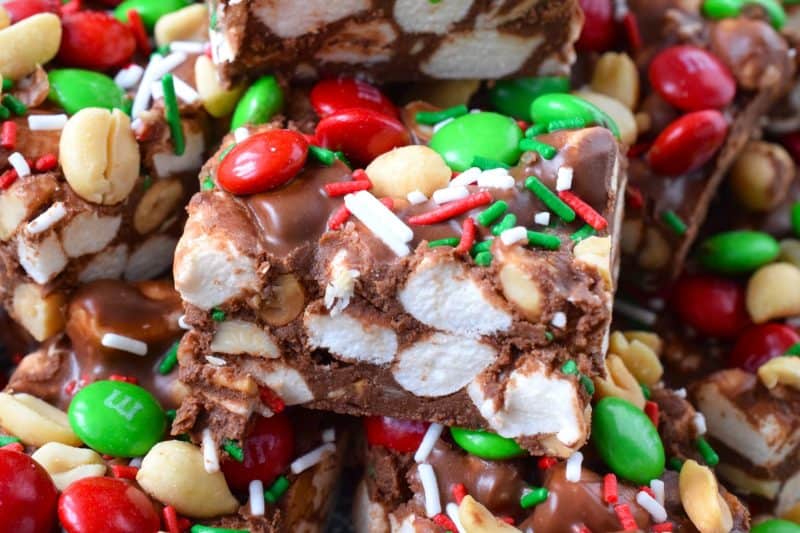 Homemade sweet treats can’t get any easier than a fudge recipe. Holiday Rocky Road Squares combines traditional Rocky Road ingredients like chocolate, nuts, and marshmallows. Throw in some red and green M&Ms and a few sprinkles to make these festive treats! These are so delicious when served chilled right from the fridge!