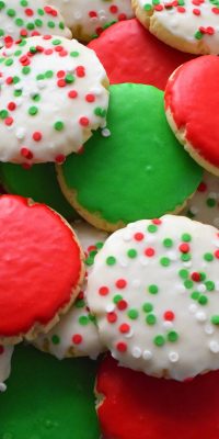 Working with one cookie at a time, dip a third of the cookies facedown into white glaze. Top with festive sprinkles. Next, dip a third of the cookies facedown into the red frosting, and the remaining third into the green. You can top these with sprinkles too if you wish. Place them onto a wire cooling rack. Allow frosting to fully dry before packaging cookies.