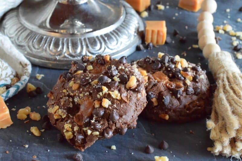 Turtles, turtles, rah, rah, rah! If you remember that jingle and you ate the popular chocolate confection that was popularized by it, then you might enjoy these Holiday Turtle Cookies too! Baked inside and outside of the most delicious chocolate cookie dough are toasted pecans, chocolate chips, and lots of sticky, gooey caramel. You’re going to love this one!