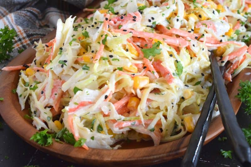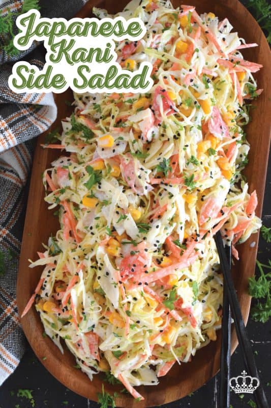 A popular side dish served with sushi, a Japanese Kani Side Salad is so delightfully refreshing, it should not be limited to just a sushi side! Prepared with imitation crab, shredded cabbage, julienned carrots and corn in a creamy and zesty sauce, this salad is wonderfully easy and exceptionally delicious!