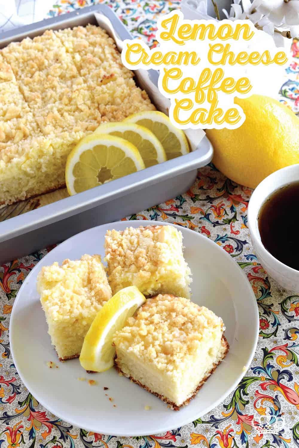Lemon Cream Cheese Coffee Cake is extra lemony, with a creamy filling and a crumbly topping.  Light, refreshing, and delicious; brew the coffee and invite your friends! That’s assuming you’ll want to share this cake with anyone after you get your first taste!