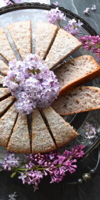 Don’t mistake me – this cake is anything but bland! In fact, I ate a slice of it without anything on it at all. It is super moist and soft and so delicately sweetened. If you’re a lover of lilac scent, this cake is for you! And, because it’s such a mellow cake, it’s perfect for pairing with a little bit of whipped cream and a piping hot cup of tea or coffee!