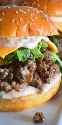 Top the bottom bun with sauce and then a generous helping of the ground beef mixture. I like to use a spring operated ice cream scoop to mound it high. Next, top the meat with pickle slices and the shredded lettuce. Add a slice of cheese. Smear the top half of the bun with more sauce and smoosh it onto the burger. Don’t worry if some of the meat falls out. That’s exactly what it should do!
