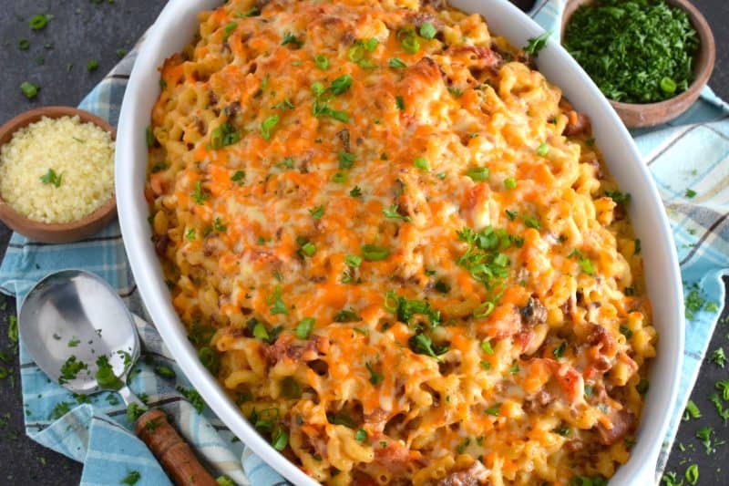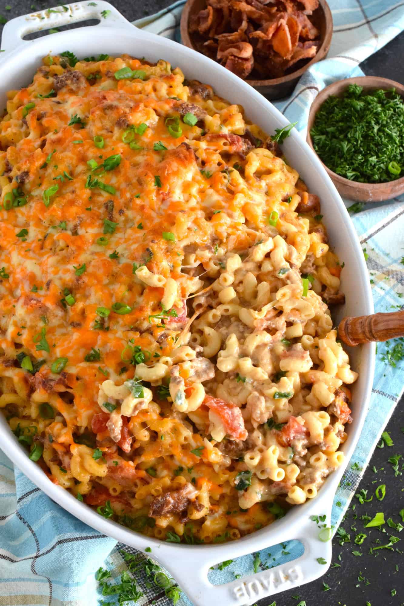 Lower the heat to simmer and add 4 cups of cheese. Stir until the cheese is melted. Turn off the heat. Next, stir in the diced tomatoes. Add the cooked macaroni, meat mixture, crumbled bacon, and green onions. Stir well into the cheese sauce. Transfer the mac and cheese to a greased casserole dish or baking pan. Smooth out the top. Top with the remaining cup of shredded cheese. Bake at 350 degrees for 45-50 minutes or until the cheese on top is melted and bubbly. Serve immediately.