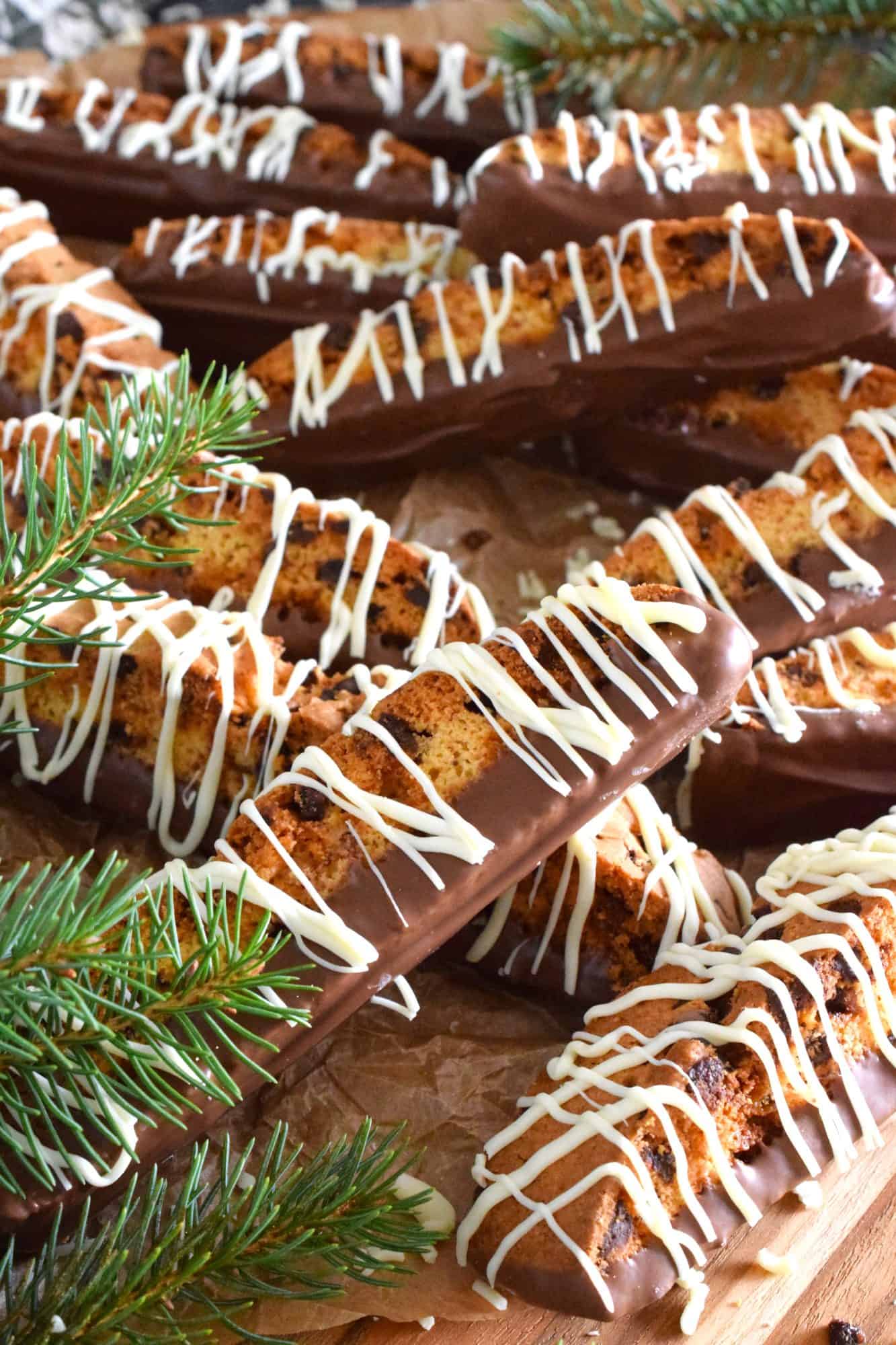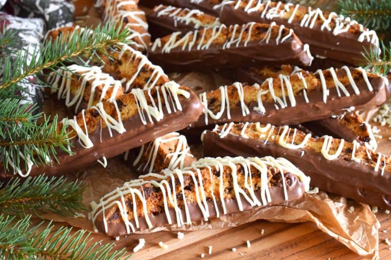 - Transfer the melted white chocolate to a resealable sandwich bag. Cut a small hole in one lower corner. Drizzle the chocolate over the biscotti. Allow the chocolate to firm and harden.