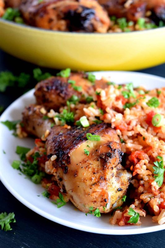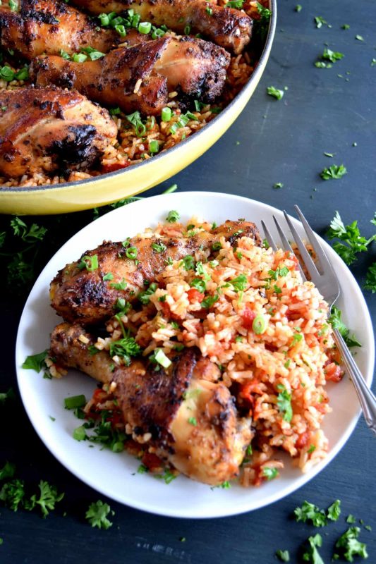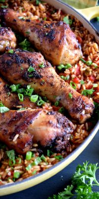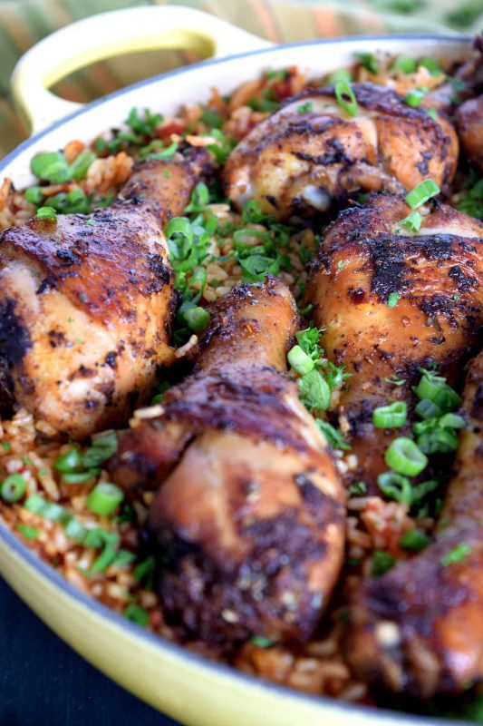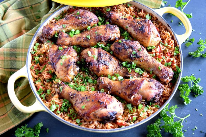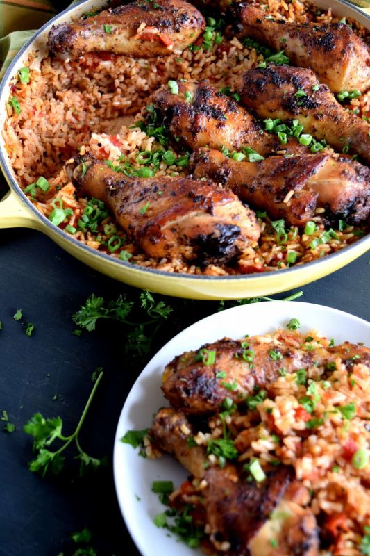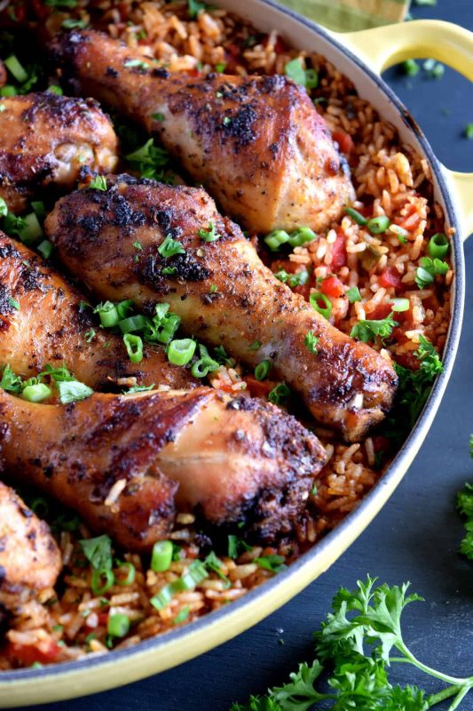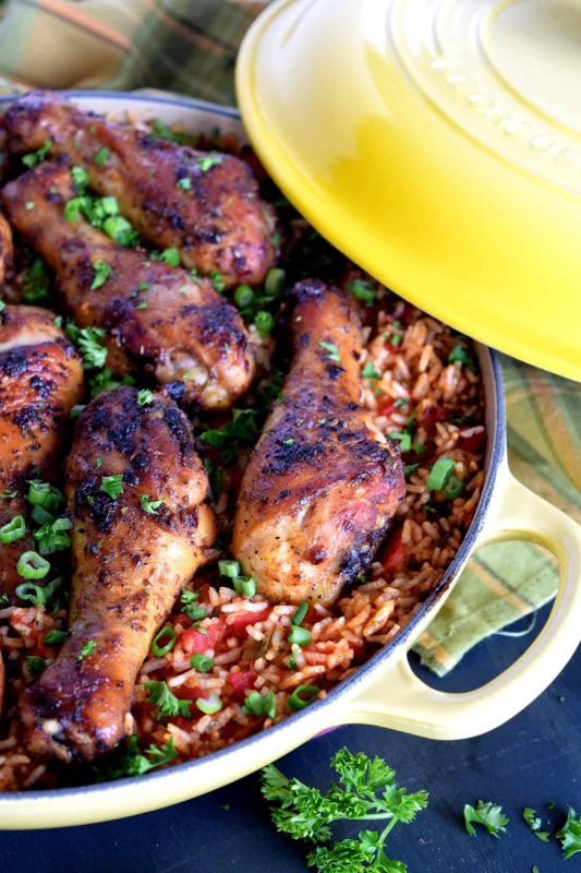 - Place the chicken drumsticks back into the pan and using tongs, nestle the chicken gently unto the top of the rice.