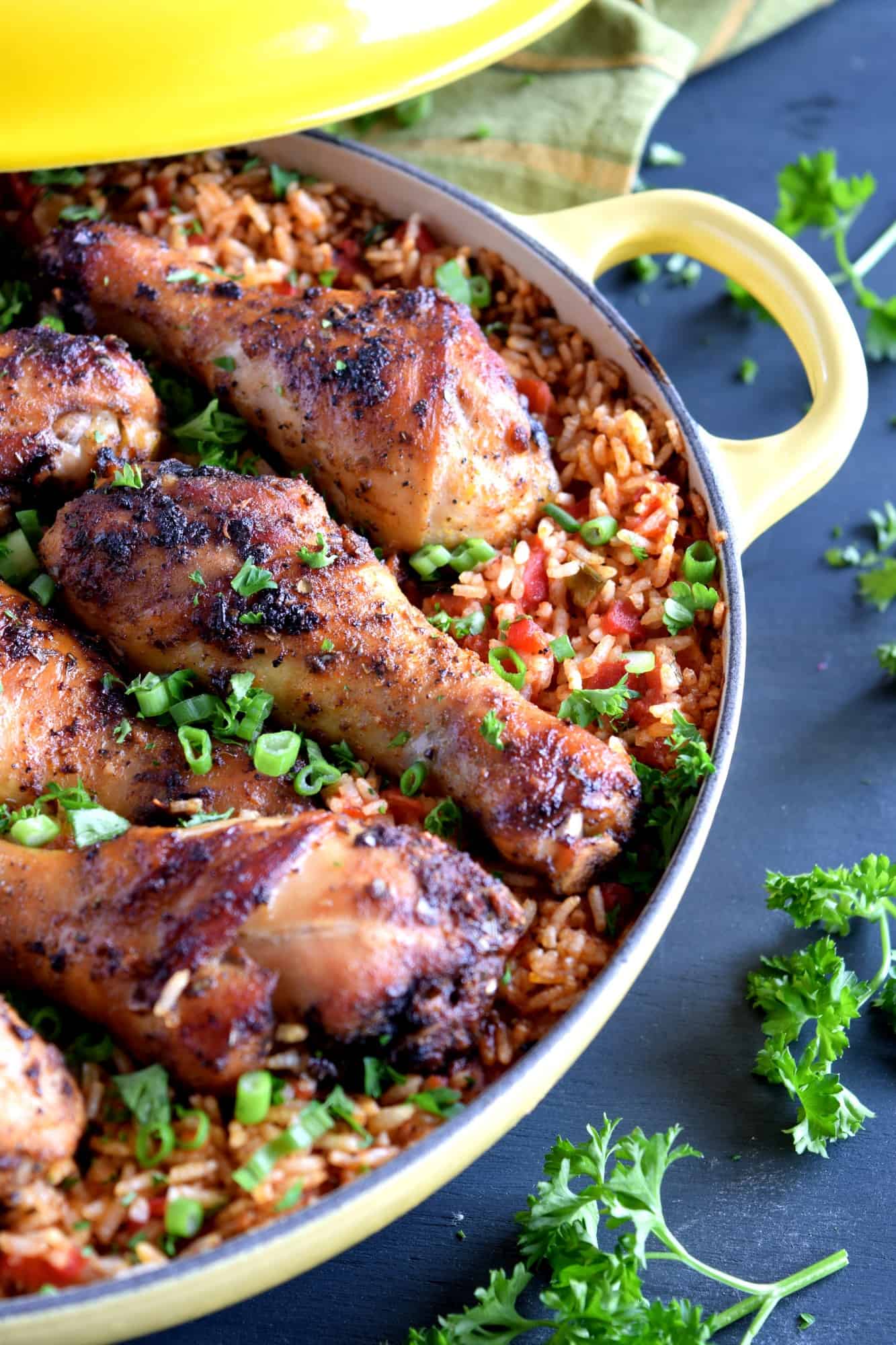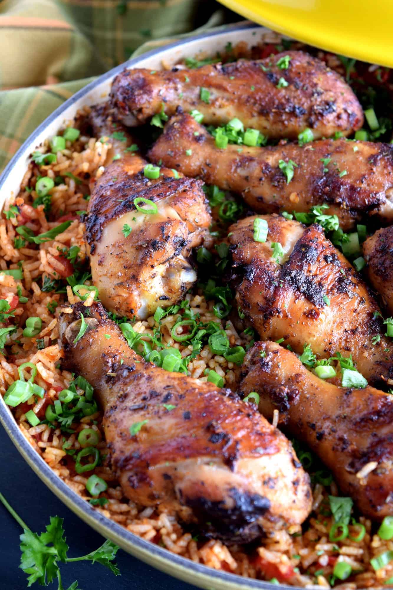 - Place the chicken drumsticks back into the pan and using tongs, nestle the chicken gently unto the top of the rice.