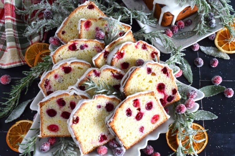 Once you remove the loaf from the oven, it is very important to leave it in the pan. Place the pan onto a wire cooling rack. Leave the cake to cool for 10 minutes. Remove the cake from the pan and allow to fully cool before serving. To make the glaze, whisk together the confectioner’s sugar and orange juice until smooth and creamy. Drizzle it over the cooled loaf. Top with the sugared cranberries and rosemary for garnish – optional.