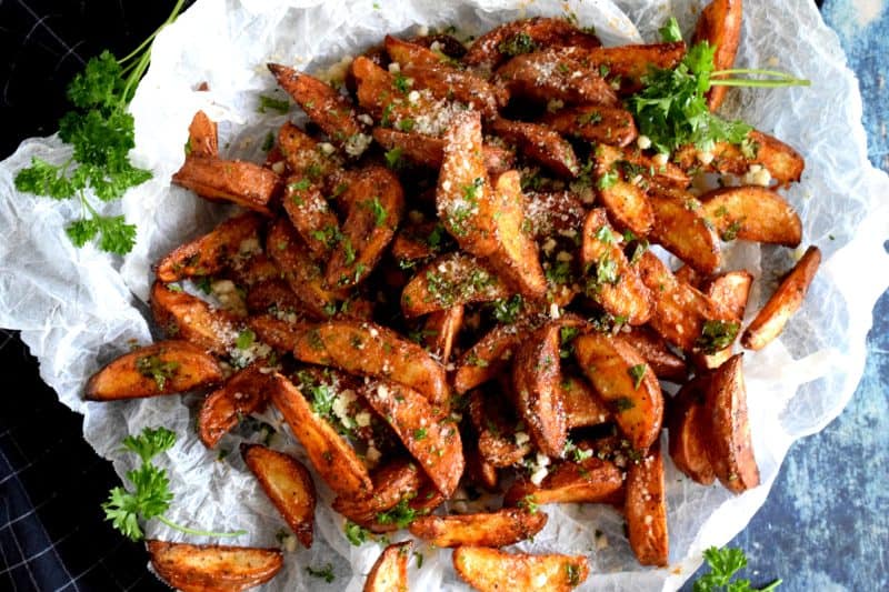 Roasted to perfection and perfectly seasoned, Paprika and Parmesan Potato Wedges are the perfect side dish – smoky, garlicky, onion-y, and cheesy – could these get any better? Oftentimes, these are served with finger foods like pizza or chicken wings.