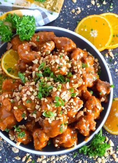 A quick and easy main perfect for a weeknight dinner at in busy household, this sweet and savoury Peanut Orange Chicken is ready to plate and serve in 45 minutes! The bold flavours in this chicken should shine, so serve it with plain cooked rice and steamed broccoli!