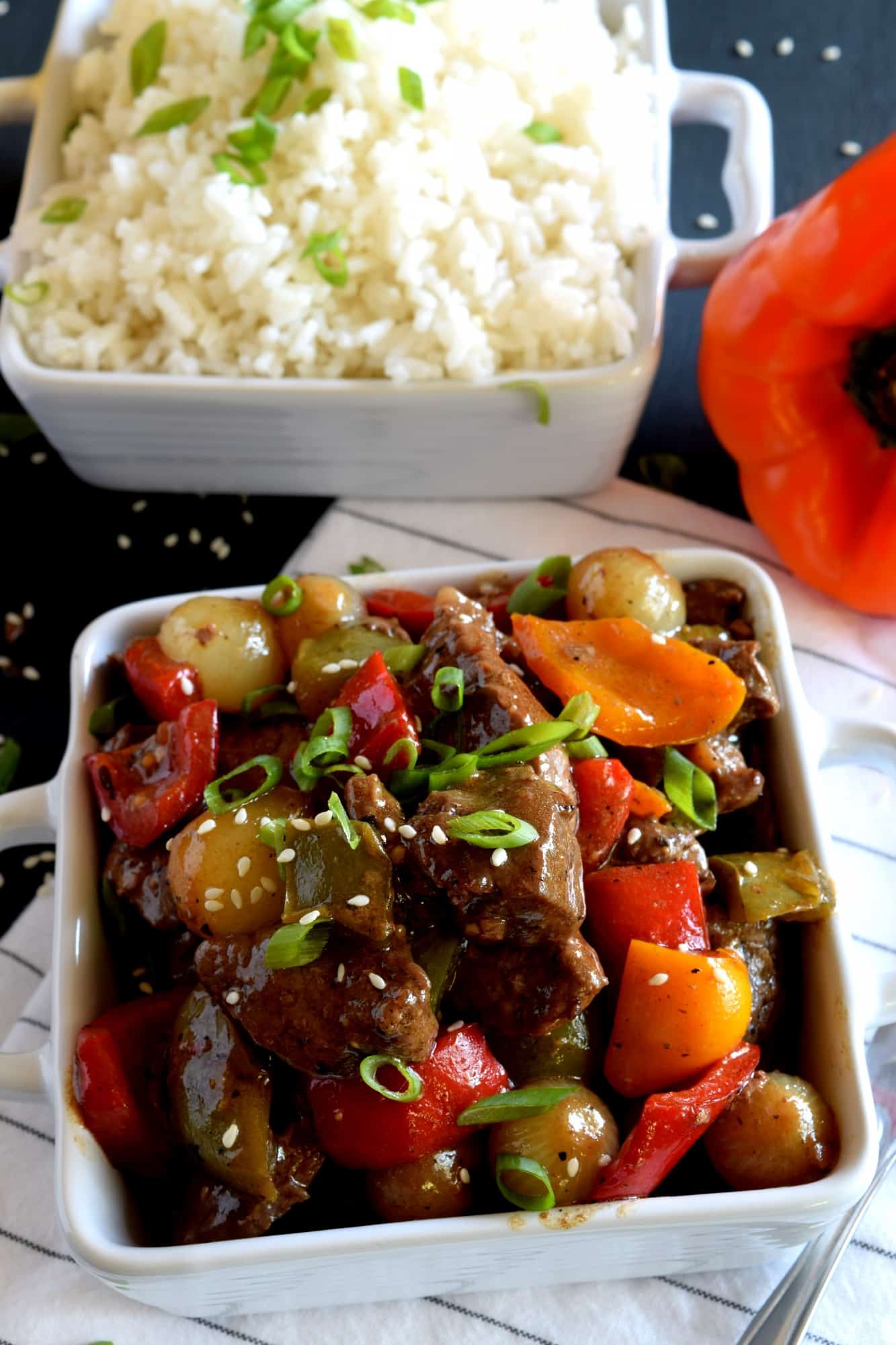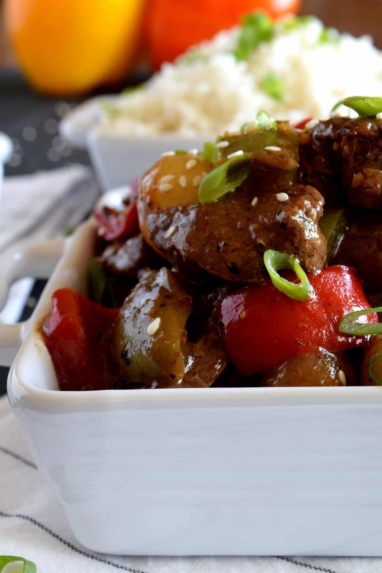 But, I was able to squeeze about four pounds of beef sirloin in there anyway. But, I knew I couldn’t keep the beef in there for very long, so this past Sunday, I had a beef cooking day. Yes, a beef cooking day – you read that correctly! I spent all of Sunday morning preparing two separate beef recipes, taking photos of the prepared dishes, and cleaning it all up. It was worth the effort, because both dishes were delicious. This Pepper Steak with Pearl Onions recipe was one of the dishes I prepared.