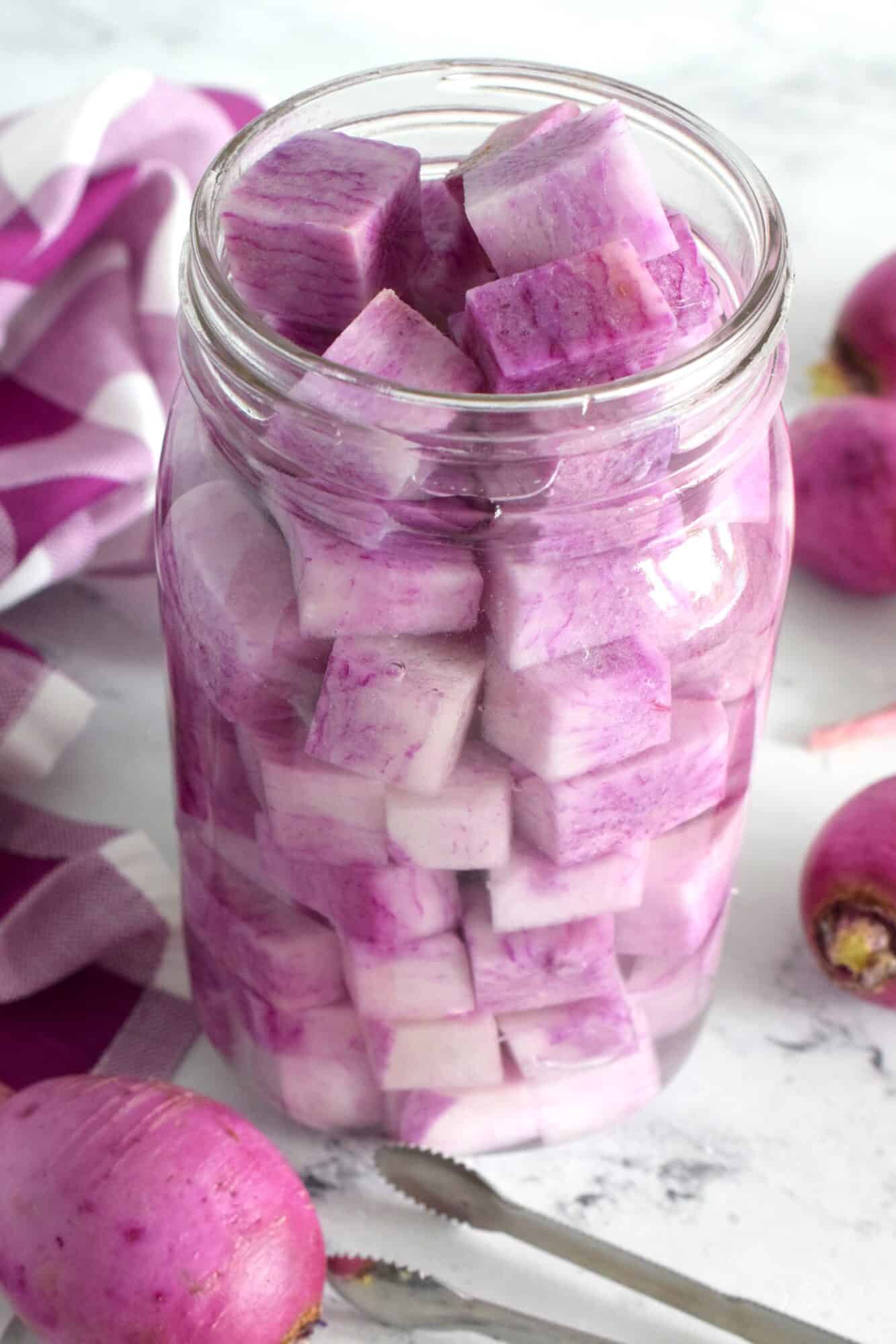 - Pile the cubed diakon radish into a very clean jar. Really stuff them in tightly and you can pack them right up to the rim. Set aside.