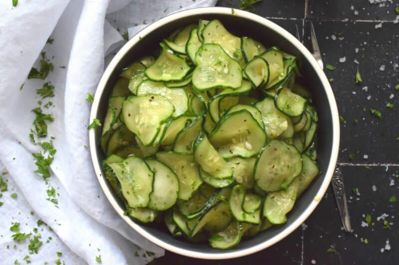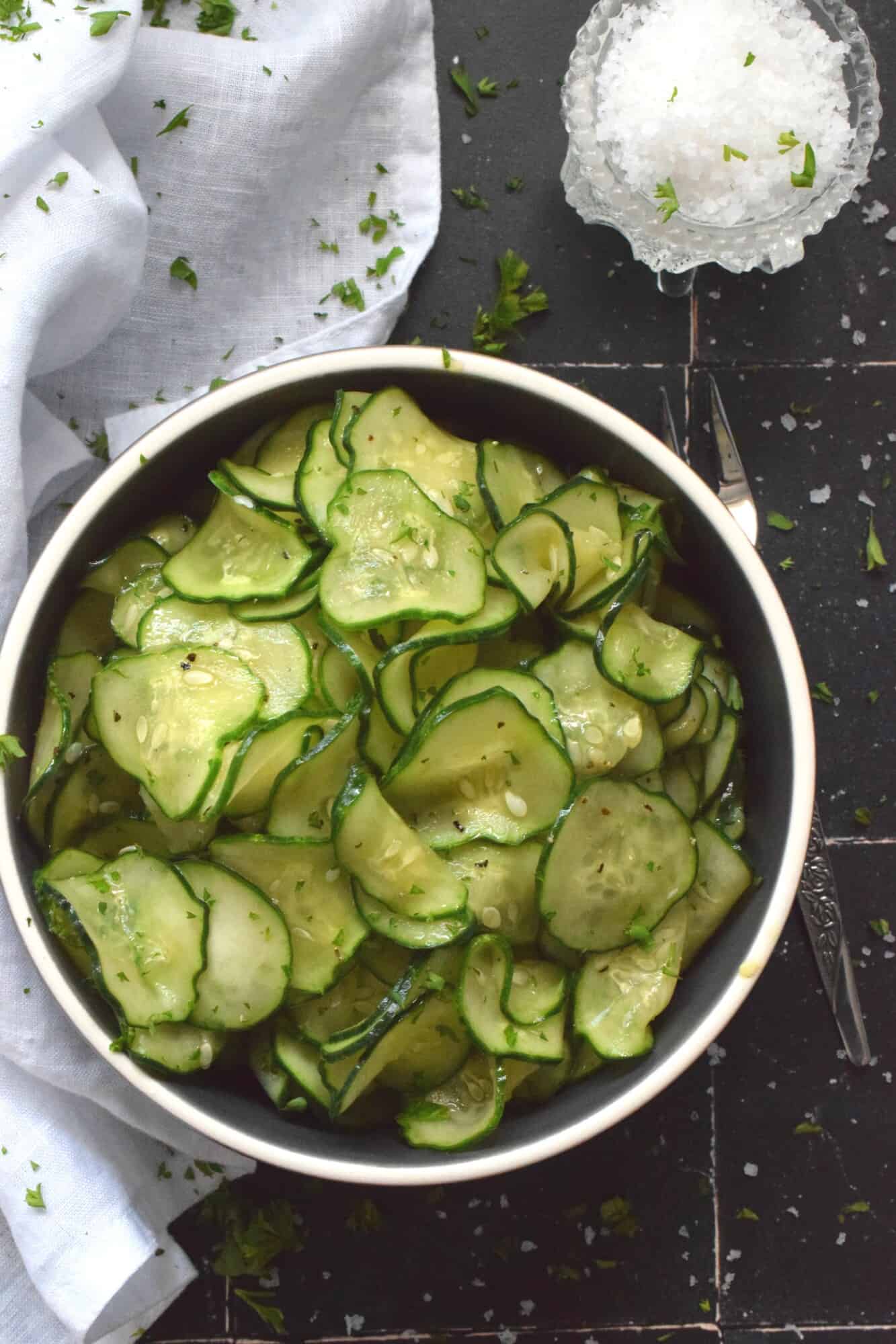 The combination of salt and vinegar is a classic and can be found in various snacks, especially as a topping and seasoning for fish and chips! Although those might be deemed junk food, one cannot say the same for this cucumber recipe! Salt and Vinegar Cucumber is such a refreshing and welcome change! Made with malt vinegar and sea salt, these cucumbers are a great side for almost any main!