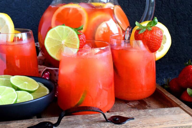 - To serve, poor into glasses and garnish with fresh strawberries, ice, and sliced lemon and lime.